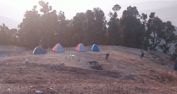 After around 5.5 km of trekking, the forest opens up into a small meadow featuring the Nag Mandir at its center, offering breathtaking views of the surrounding valleys. The widespread open ground at the campsite makes way for spectacular sunset views, followed by a magical night sky glittered with stars.